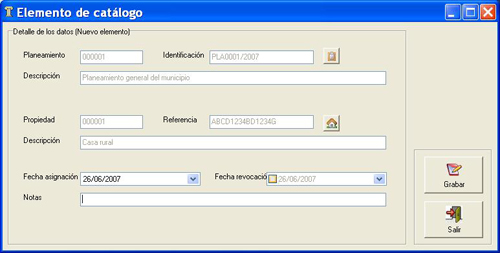 Disponible para todos los m贸dulos, nos permite eliminar el registro seleccionado en la lista. Antes de eliminarlo nos pedir谩 confirmaci贸n. Asociar un nuevo derecho real al elemento seleccionado Disponible para Propiedades y Personas, nos permite acceder a la pantalla de introducci贸n de un nuevo derecho real con la Propiedad o la Persona ya seleccionada. Asociar una propiedad al planeamiento seleccionado