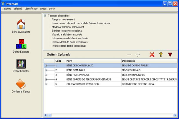 4. Mòduls Dins dels mòduls hi destaquen els següents: A. Béns inventariats Aquest mòdul permet la introducció, modificació i supressió de les dades dels béns que es volen introduir al registre d'inventari. B. Definir epÃgrafs Mitjançant aquest mòdul es poden definir epÃgrafs per classificar els béns d'una manera més detallada. Cada un dels epÃgrafs pot contenir fins a 4 subepÃgrafs. Els subepÃgrafs també es divideixen, obtenint, aixÃ, un tercer nivell d'epÃgrafs, encara més detallat.